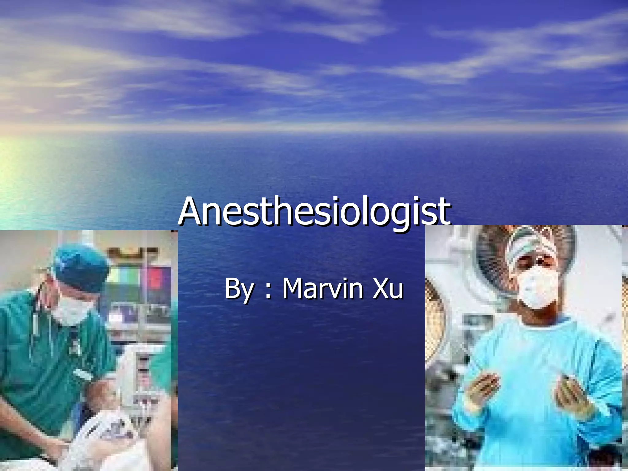 An anesthesiologist's education and training involves completing college, medical school for four years each, and then four years of specialized training in anesthesiology. They monitor patients' vital signs during surgery, administer anesthesia, and ensure safe recovery from anesthesia. Anesthesiologists are highly paid physicians who earn a median salary of $321,686 annually, ranging from $100,000 to $375,000 depending on location and experience.