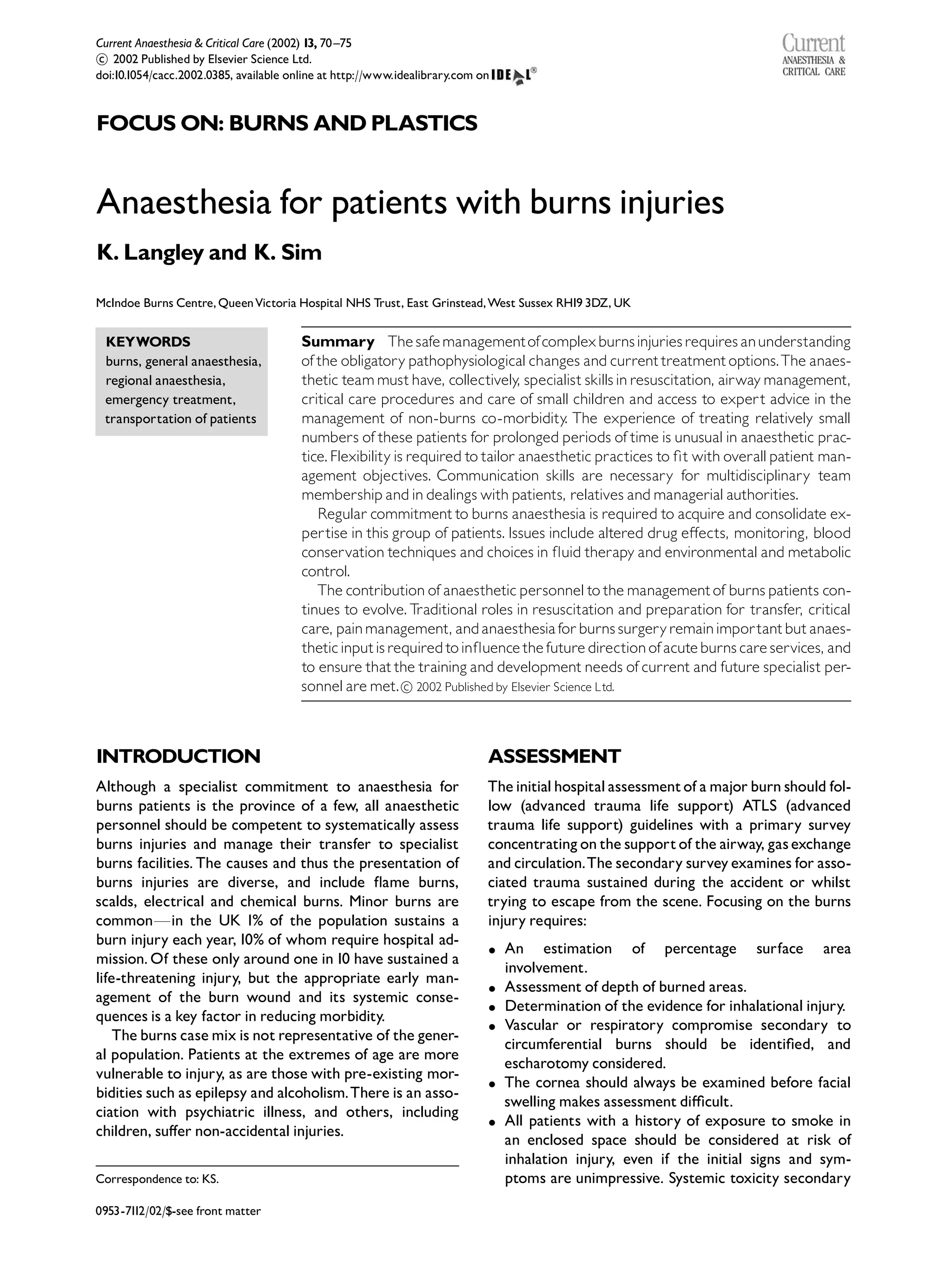 1) Anaesthesia for patients with burns injuries requires an understanding of the obligatory pathophysiological changes and current treatment options.