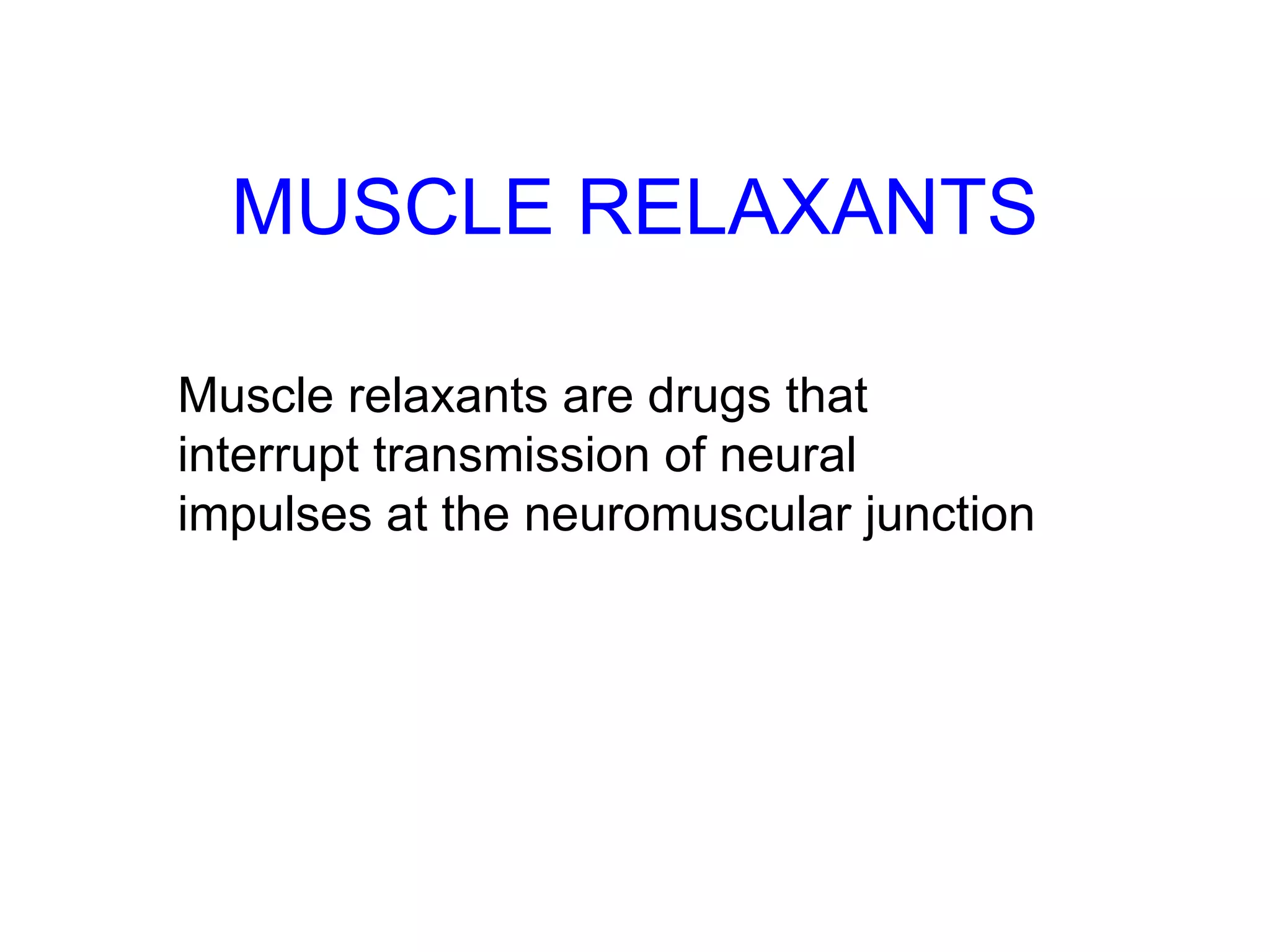 Muscle relaxants are drugs that interrupt neural impulses at the neuromuscular junction. They provide skeletal muscle relaxation for procedures like intubation and surgery. The choice of muscle relaxant depends on its onset, duration, route of elimination, and side effects. They work by blocking nicotinic cholinergic receptors at the neuromuscular junction. Anticholinesterases can reverse the effects of nondepolarizing muscle relaxants by inhibiting acetylcholinesterase and increasing acetylcholine levels.