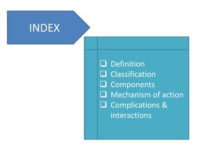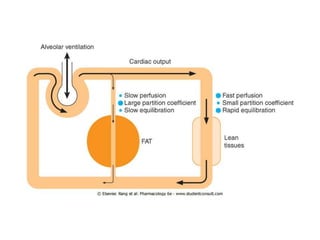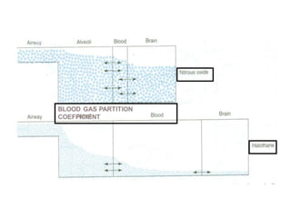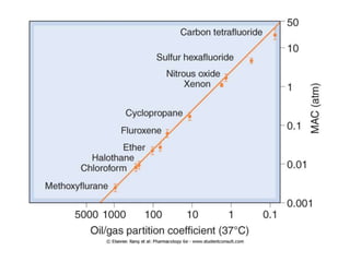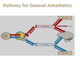 General anesthetics are drugs that produce reversible loss of sensation and consciousness. They work by depressing brain function from the cortex down to the medulla. There are two main types - inhalational anesthetics which are gases or vapors inhaled, and intravenous anesthetics which are injected. Both work by inhibiting excitatory neurotransmitters like glutamate while enhancing inhibitory neurotransmitters like GABA. This raises the threshold for electrical signals in the brain and lowers responsiveness to stimuli. While very effective at inducing unconsciousness, general anesthetics must be carefully monitored as the line between surgical anesthesia and respiratory/circulatory failure is narrow.