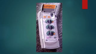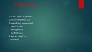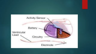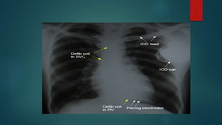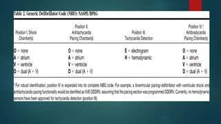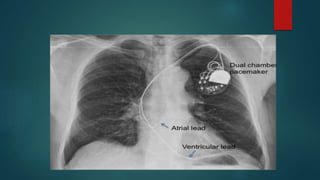 The document discusses cardiac pacemakers and implantable cardioverter defibrillators (ICDs). It covers the history, components, functions, types of pacing modes, indications for use, problems that can occur, and considerations for anesthetic management of patients with these devices. The key points are that pacemakers are used to treat bradycardia while ICDs treat tachycardia/fibrillation. Care must be taken with electromagnetic interference and device function needs to be considered for any procedures.