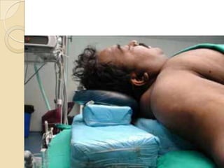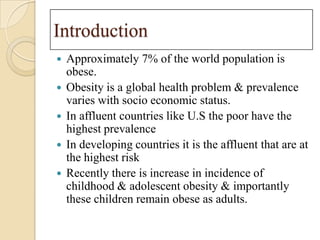 This document discusses anesthesia considerations for bariatric surgery. It begins with definitions of obesity classifications based on BMI. It then discusses the increased risks that obese patients face from cardiovascular and pulmonary complications. Key points in the anesthetic management include careful preoperative evaluation and optimization of comorbidities, strategies for airway management and ventilation given the increased risk of difficulties, appropriate patient positioning and monitoring during surgery, and thromboprophylaxis given the risk of VTE. Overall anesthetic goals are to prevent hypoxemia and carefully manage any cardiovascular or pulmonary issues.