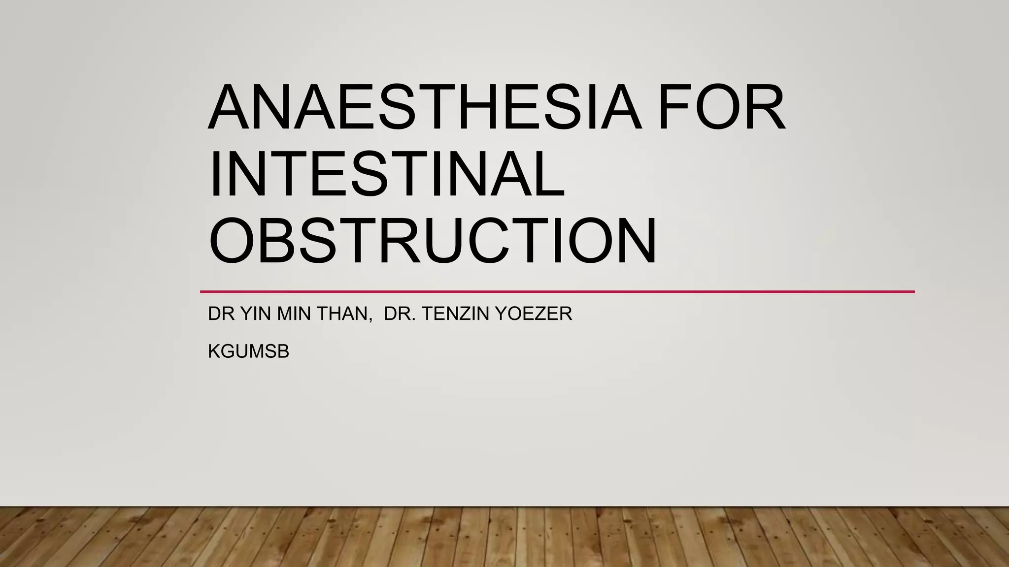 The document discusses anaesthesia management for intestinal obstruction, distinguishing between simple and strangulated bowel obstructions, the symptoms, and the associated risks of mortality. It outlines the perioperative management of fluid and electrolyte imbalances, respiratory issues, and the importance of careful monitoring during induction and extubation. Additionally, it emphasizes the need for both preoperative and postoperative care to mitigate complications, including managing abdominal distension and ensuring effective ventilation.