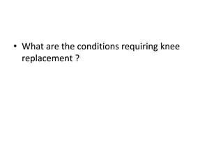This document discusses anesthesia considerations for total knee replacement (TKR) surgery. It covers preoperative evaluation of cardiopulmonary and musculoskeletal systems, anesthesia techniques including spinal, epidural, peripheral nerve blocks and general anesthesia, intraoperative monitoring and tourniquet use, postoperative care including pain management, and complications associated with TKR such as blood loss, infection and venous thromboembolism. Regional anesthesia techniques are preferred due to advantages like less blood loss, better pain control and early mobilization, though patient factors and surgical needs determine the best option.