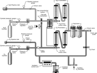 - The main components including gas cylinders, pressure regulators, flowmeters, vaporizers, breathing systems, and absorber canisters.