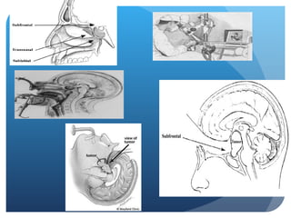 This document discusses anesthesia management for pituitary tumor surgery. Pituitary adenomas are common benign tumors that can invade surrounding structures. Risk factors include genetic conditions. Pre-operative evaluation assesses hormonal levels and effects, as well as comorbidities related to hormonal hypersecretion like acromegaly and Cushing's syndrome. Anesthetic management aims to maintain hemodynamic stability, cerebral oxygenation, and facilitate surgery while preventing complications. Special considerations include potential airway difficulties and post-operative hormone replacement or complications such as diabetes insipidus or hyponatremia.