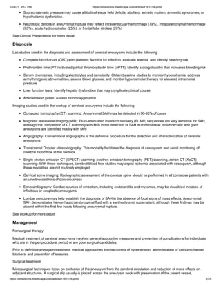 Cerebral aneurysms are abnormal bulges or sac-like outpouchings in the walls of arteries in the brain. When they rupture, they cause a subarachnoid hemorrhage (SAH), which has devastating consequences - about 10-25% of people die within 24 hours and 40-65% die within 3 months of the SAH. Survivors often suffer permanent disabilities. Cerebral aneurysms are diagnosed using CT scans, MRI, angiography and other imaging tests and treatments involve surgical clipping or endovascular coiling to prevent further bleeding.