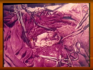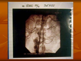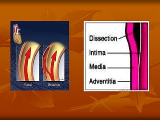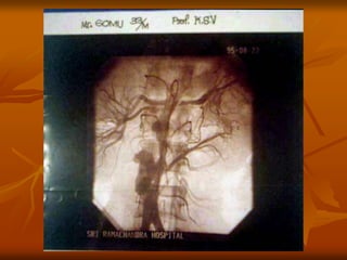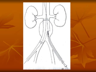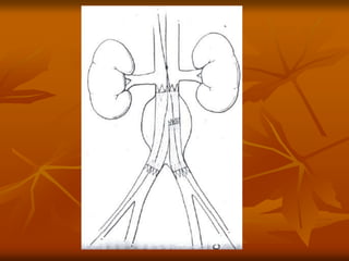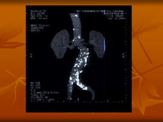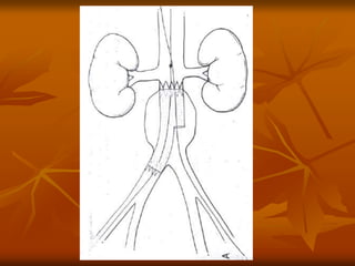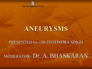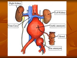The document outlines a seminar presentation on aneurysms. It discusses the introduction, historical aspects, classification, abdominal aortic aneurysm, surgical management, and recent advances related to aneurysms. The presentation covers the definition, etiology, location, morphology, and pathogenesis of different types of aneurysms. It provides details on abdominal aortic aneurysms including risk factors, natural progression, clinical presentation, diagnosis using imaging modalities like ultrasound and CT, and treatment.
