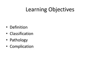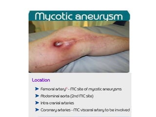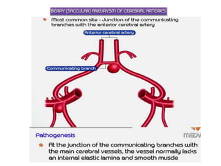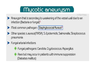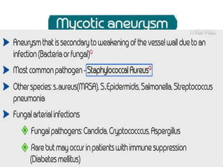 1. An aneurysm is an abnormal dilation of a blood vessel that can be congenital or acquired due to weakening of the vessel wall.