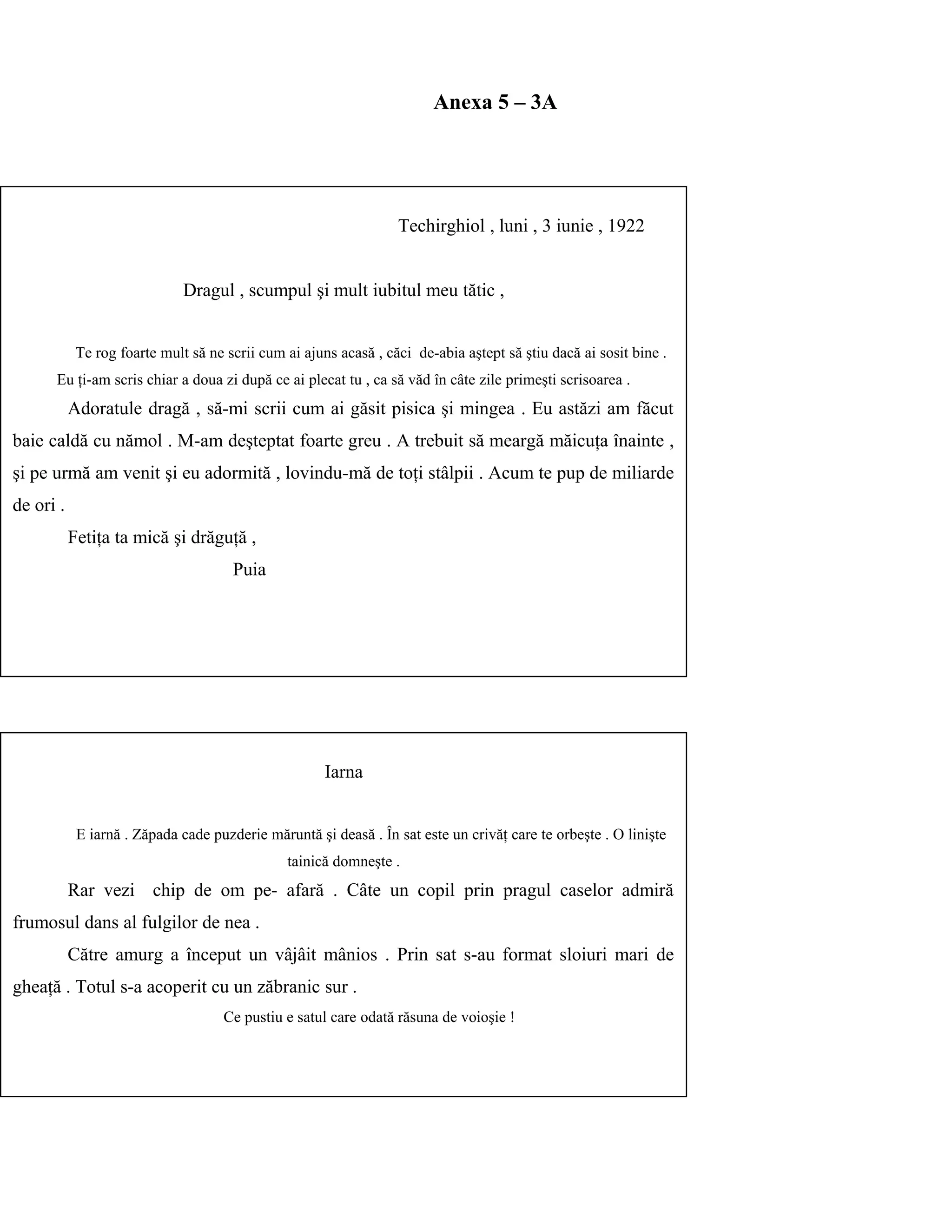 Scrisoarea este adresată tatălui și exprimă dorința de a afla despre întoarcerea sa acasă. Mesajul include o descriere a vremii și a stării satului în timpul iernii, subliniind liniștea și pustietatea acestuia. Autoarea își împărtășește și experiențele personale, precum baia cu nămol și observațiile despre zăpadă.