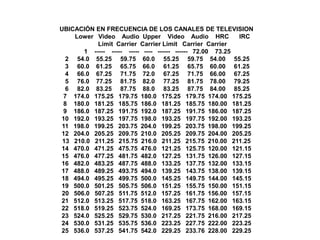 The document lists the frequency ranges for the lower video carrier, audio carrier, upper video carrier, and audio carrier for 25 television channels. It also includes the horizontal and intercarrier ranges for each channel. The frequency ranges are given in megahertz.