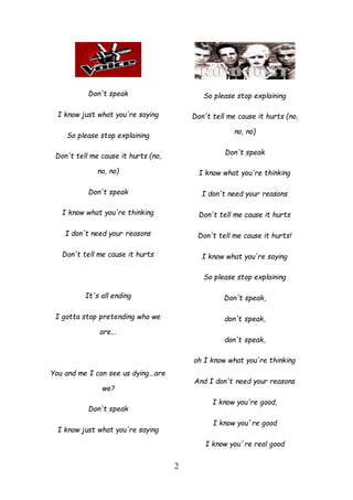 This document contains song lyrics and activities related to teaching English through music. It includes the full lyrics of 5 songs - "Don't Speak" by No Doubt, "Roar" by Katy Perry, "Someone Like You" by Adele, and "Try" by Pink. The activities provided with each song involve identifying grammar structures, sounds, and correcting errors in the lyrics. The document also includes materials for student evaluation such as a questionnaire and scoring rubric.