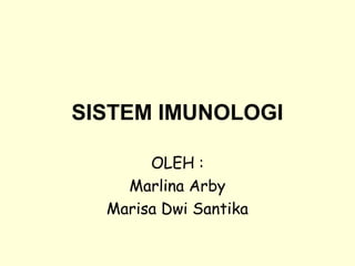 Sistem imunologi merupakan kesatuan fungsional sel dan molekul yang terlibat dalam melawan infeksi dan mempertahankan keseimbangan tubuh. Terdiri atas imunitas alami dan induksi, imunitas alami bersifat nonspesifik sedangkan induksi bersifat spesifik dan menghasilkan memori. Komponen kunci sistem imun meliputi sel darah putih, antibodi, sitokin, dan respon inflamasi untuk melawan patogen.