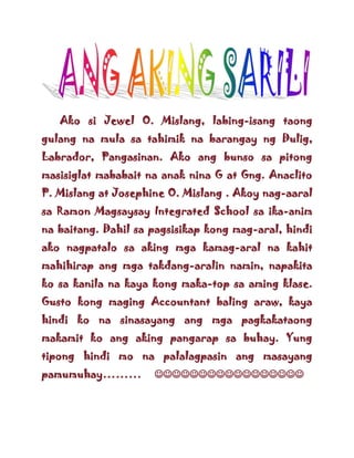 Si Jewel O. Mislang, isang labing-isang taong gulang na estudyante mula sa barangay Dulig, Labrador, Pangasinan, ay ang bunso sa pitong anak at nag-aaral sa ika-anim na baitang sa Ramon Magsaysay Integrated School. Sa kabila ng mga hamon sa takdang-aralin, siya ay nagsikap upang maging top ng kanyang klase at nagtataguyod ng pangarap na maging accountant. Kasama ng kanyang kwento, nagbahagi siya ng mga salitang sagot sa iba't ibang mga palaisipan.
