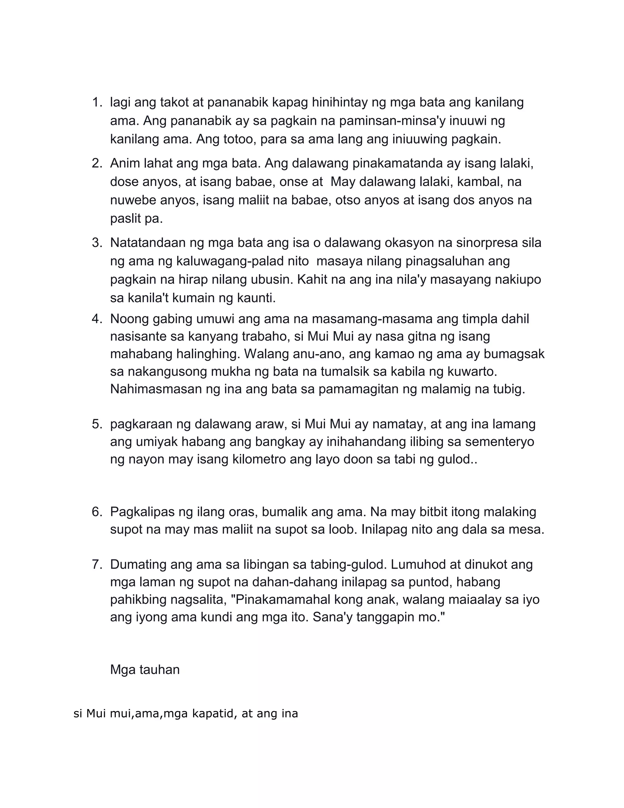 Ang kwento ay tungkol sa isang ama at ang kanyang mga anak na sabik na naghihintay sa kanyang pag-uwi, dala ang pagkain. Subalit, matapos ang isang trahedya na naganap, kung saan ang isa sa mga anak na si Mui Mui ay namatay dahil sa pananakit ng ama, nagdala ang ama ng mga bagay sa libingan bilang huli niyang alay sa kanyang anak. Ang kwento ay naglalaman ng tema ng takot, pananabik, at matinding kalungkutan sa pagkawala ng isang mahal sa buhay.