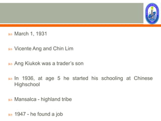 Ang Kiukok was a Filipino painter born in 1931 in the Philippines. He started his schooling at age 5 and later studied Fine Arts in Manila. Some of his most notable works include Pieta and Boats. His style evolved to cubism in 1958. He was awarded National Artist by the President of the Philippines in 2001 in recognition of his artistic achievements and contributions. Ang Kiukok was known for his honest and unconventional paintings that depicted harsh truths in life. He continued painting passionately until his death in 2005.