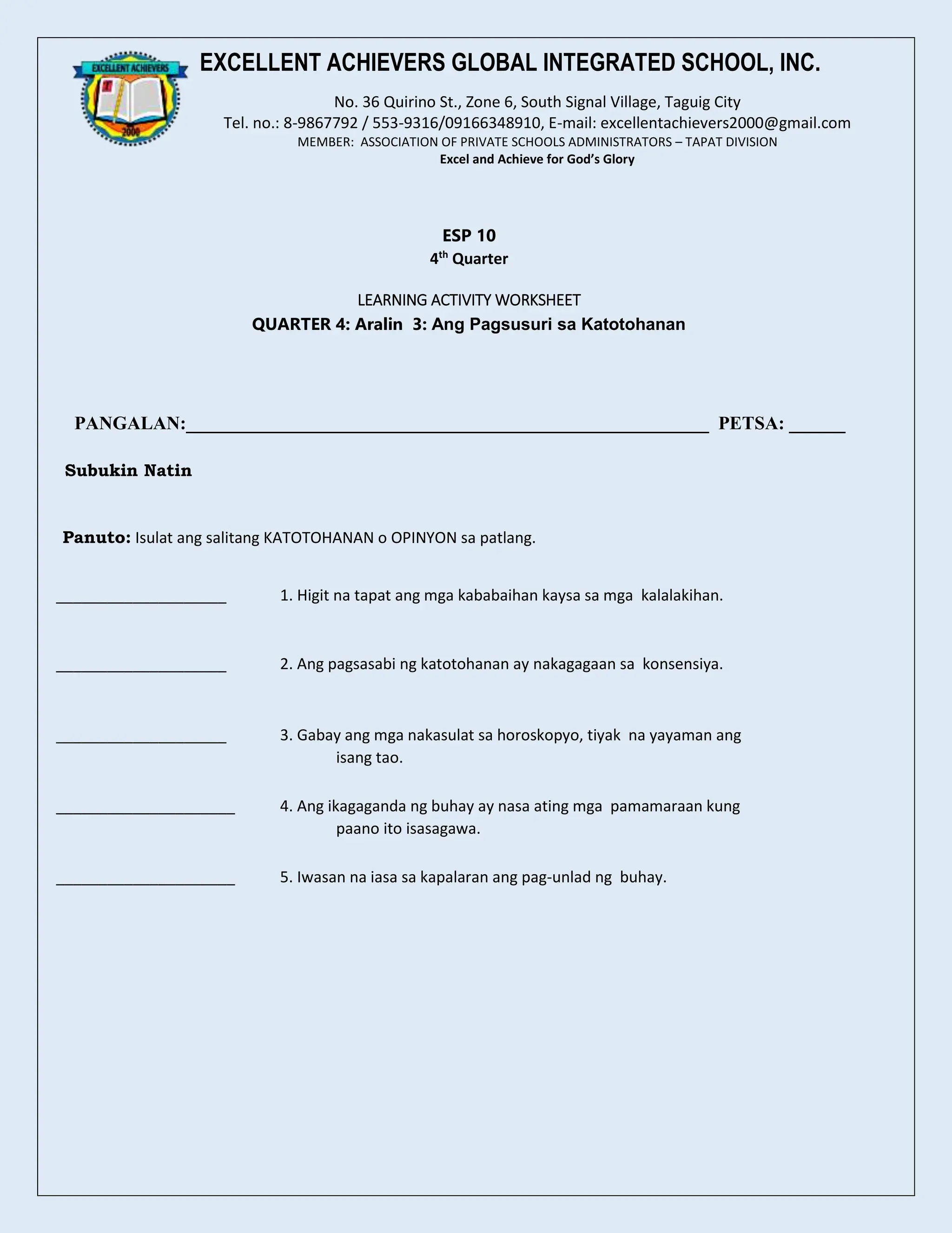 Ang dokumento ay isang learning activity worksheet na tumatalakay sa pagsusuri ng katotohanan. Nagtatampok ito ng mga saknong na naglalarawan ng mga katangian ng katotohanan, kabilang ang pagiging matatag, universality, at obhektibidad nito. Meron ding mga pagsasanay at rubriks upang suriin ang pag-unawa ng mga estudyante sa mga konsepto ng katotohanan at opinyon.