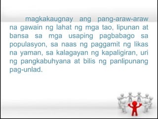 Ang Kabanata 16 ay nagtalakay sa ugnayan ng populasyon at pag-unlad, na nagpapakitang ang paglaki ng populasyon ay may direktang epekto sa likas na yaman, kalagayan ng kapaligiran, at ekonomiya ng mga bansa. Kabilang sa mga pangunahing suliranin ang kahirapan, kakulangan sa pagkain at edukasyon, at pagkasira ng kapaligiran dulot ng labis na pagkonsumo. Ang mga programa at organisasyon ay naglalayong magkaroon ng mga tamang patakaran at impormasyon upang mapababa ang fertility rate at masimulan ang mas sustainable na pag-unlad.