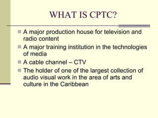 CPTC is a major production house, training institution, and cable channel in Jamaica with extensive audiovisual resources. It holds one of the largest collections of arts and culture materials in the Caribbean in its library containing over 30,000 hours of video and 2,000 publications. CPTC aims to digitize its indigenous footage and make its library accessible online as part of a library network, allowing public access to cultural resources across institutions. It envisions strategic alliances and collaboration to promote sharing of cultural materials, engage the diaspora, and support education through its vast library collections.