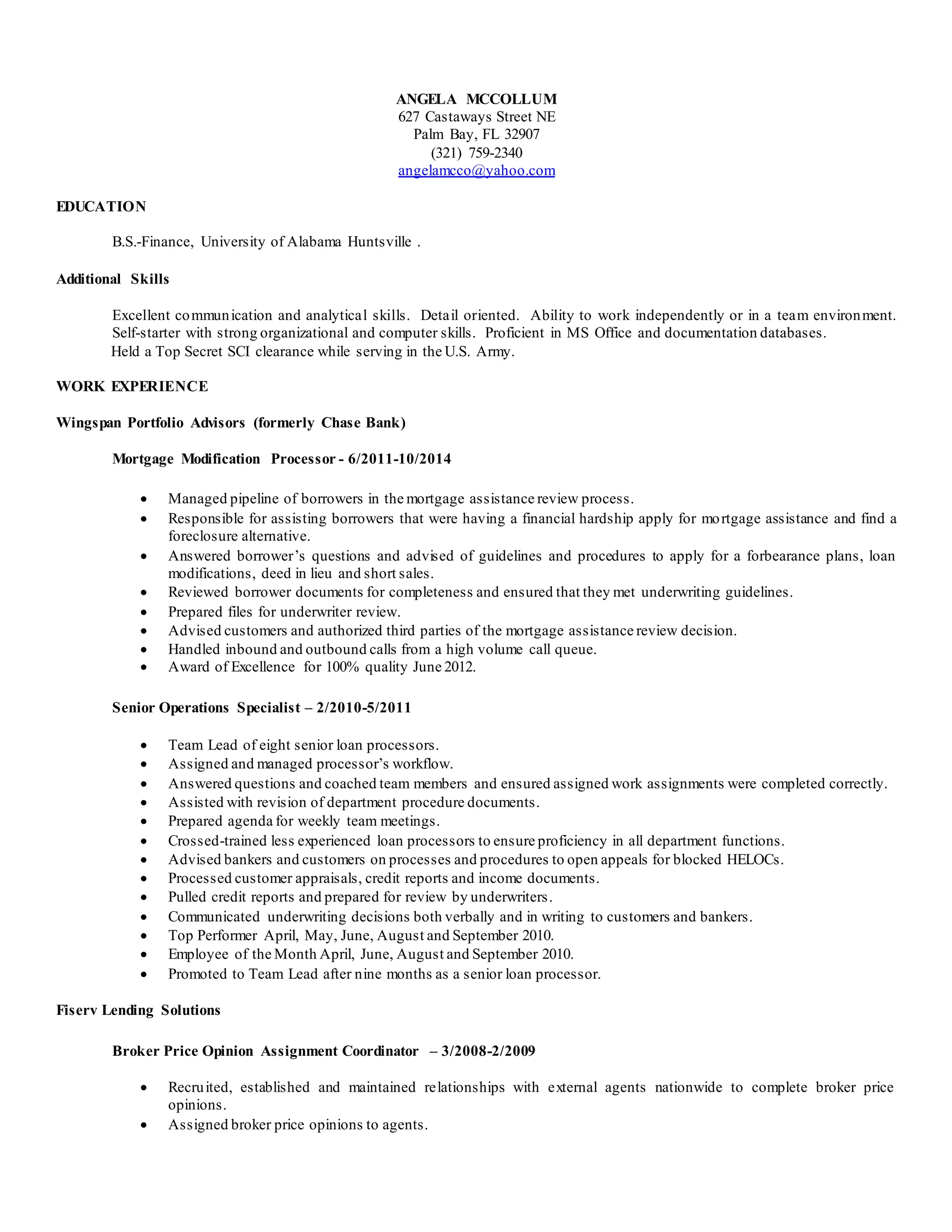 Angela McCollum has over 15 years of experience in mortgage lending and financial services. She has held roles as a mortgage modification processor, senior operations specialist, mortgage loan processor, and broker price opinion coordinator. Her experience also includes contract support, geospatial analysis for the U.S. Army, and she holds a B.S. in Finance.