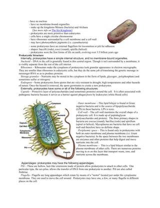 - Prokaryotes are single-celled organisms without nuclei or organelles that include bacteria and archaea. They have circular chromosomes, ribosomes surrounded by cell membranes and walls, and may have flagella or pili.
