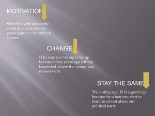 The document discusses political issues in the United States. It advocates for providing healthcare access to all citizens regardless of socioeconomic class, as healthcare is essential. It also emphasizes the importance of the Fourth Amendment, which protects against unreasonable searches and seizures. The document suggests these are important issues that will help both current and future generations.