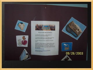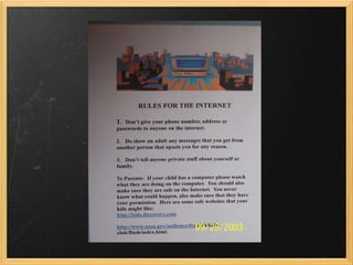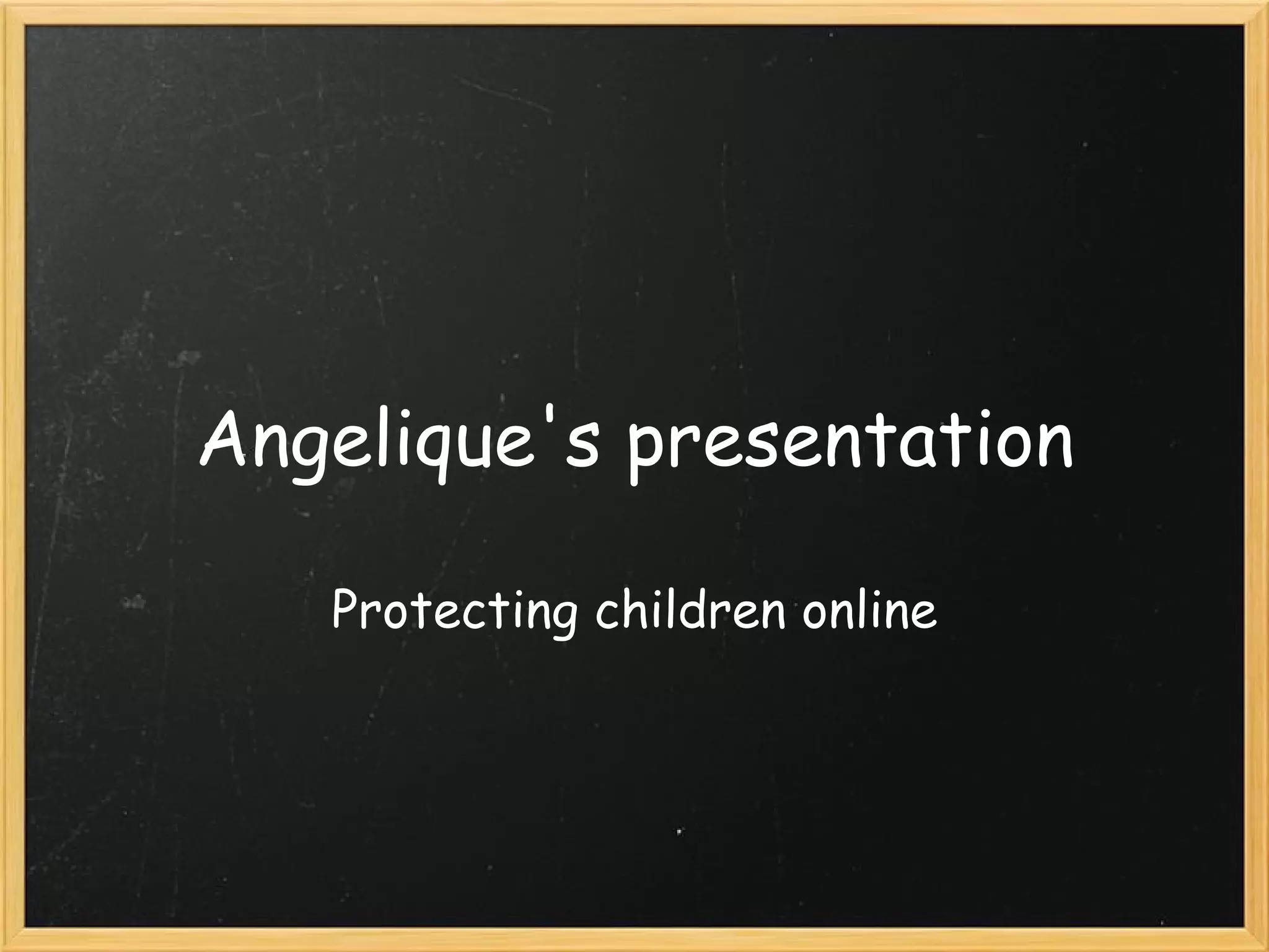 Angelique presented on protecting children online. She chose this topic because both she and many other kids and teens spend a lot of time online and may share private information or interact with strangers. Her presentation defined common online terms and discussed statistics showing many teens share private information or do things online they wouldn't want parents to know. To help address the problem, Angelique made flyers and posters with tips for staying safe online, such as not sharing personal information or passwords with unknown people and telling an adult about any upsetting messages.