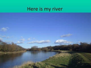 The document describes a river near the author and analyzes what stage it is in based on its features. The author believes the river is in the middle course stage because it has meanders, is wide but not as wide as a lower course river, is quite deep with ripples, and has more water than earlier stages. Photos are included of a river meander, close-up of ripples, and descriptions of the angular, sub-angular, and sub-rounded rocks found along the river.