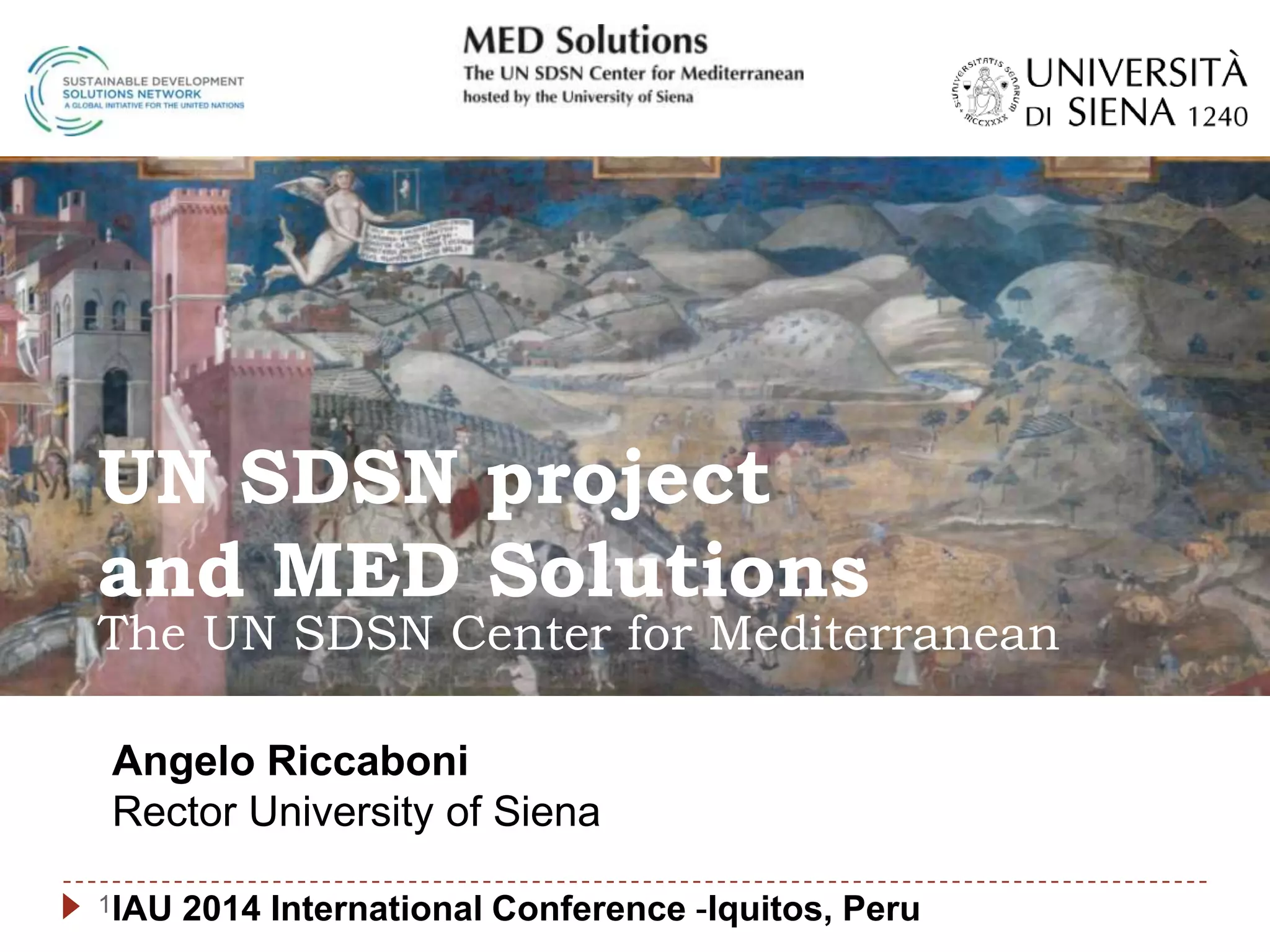 The document discusses sustainable development goals and initiatives in the Mediterranean region. It describes how over 1 billion people still live in extreme poverty without access to basic services. It outlines the Millennium Development Goals and progress made towards reducing poverty, improving health and education. However, improvements were not equal across countries. The document introduces the Sustainable Development Goals and the UN Sustainable Development Solutions Network, which identifies solutions to promote sustainability. It establishes the MED Solutions network to coordinate universities and organizations working on solutions in the Mediterranean region.