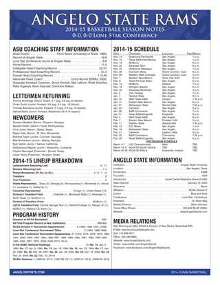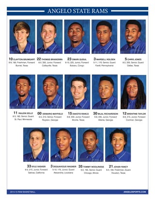 The document provides information on the 2014-15 Angelo State Rams basketball team, including their coaching staff, returning lettermen, newcomers, roster breakdown, program history, and schedule. Head coach Chris Beard is in his third season with the Rams and has an overall coaching record of 113-39. The Rams return 4 lettermen from last season including senior guard Tommy Woolridge, and have added 8 transfers and 2 freshmen to the roster for the upcoming season.