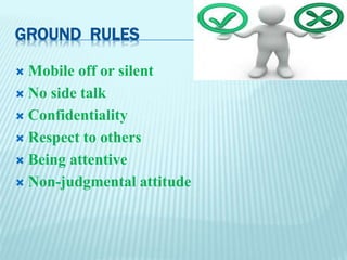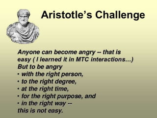 This document discusses anger and anger management. It begins with ground rules for the discussion and objectives to identify anger triggers and styles. It then defines anger as a natural emotion related to feeling offended or wronged. The document differentiates between anger as a feeling and aggression as a behavior. It discusses the most common triggers for anger and asks participants to identify their own triggers and cues for anger. It describes three common anger styles: dumping anger on others, acting out aggressively, and burying anger internally. The document outlines potential consequences of each style and asks participants to identify their own style. It then provides techniques for managing anger effectively such as cooling off, sorting through the problem, channeling energy into positive outlets, and practicing relaxation. The