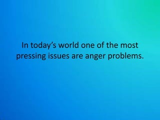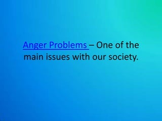 Uncontrolled anger is a major problem in society that stems from an inability to properly manage emotions. While anger is a normal human emotion, some people express it in harmful ways like bullying, abuse, or violence. Anger management classes teach techniques to control emotions through exercise, journaling, and meditation in order to reduce stress and express anger in positive ways. If more people adopted these anger management strategies, it could help create a more peaceful world with less crime and conflict.