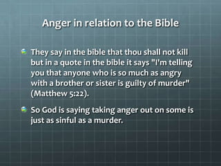 The document discusses anger management and controlling anger. It notes that the Bible says feeling anger is akin to murder. Anger is a signal that something is wrong but does not solve problems. There are three options when confronting anger: reacting angrily, becoming aware of your feelings, or controlling your intensity. Major causes of anger include dependency issues, resentment, grief, victim mentality, and abuse. The document provides ten steps for controlling anger, such as making a list of anger triggers, talking about your feelings, breathing exercises, and changing negative thoughts. Myths about anger include that it must be expressed or it will explode, while facts are that anger occurs on a spectrum and does not work like steam in a kettle.