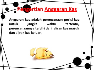 Anggaran kas merupakan perencanaan posisi kas suatu perusahaan untuk periode tertentu yang terdiri dari perkiraan penerimaan dan pengeluaran kas. Tujuannya adalah memberikan informasi mengenai taksiran arus kas masuk dan keluar perusahaan di masa datang. Dokumen ini menjelaskan pengertian, tujuan, dan fungsi anggaran kas serta contoh kasus penyusunan anggaran kas suatu perusahaan untuk tahun 2012