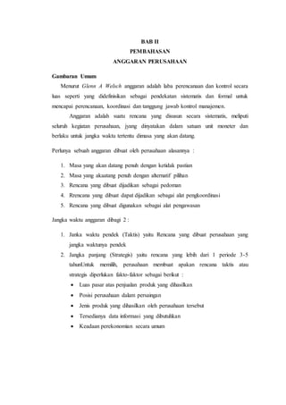 Dokumen ini membahas pentingnya penyusunan anggaran dalam perusahaan sebagai perencanaan laba dan alat kontrol manajemen. Penyusunan anggaran meliputi berbagai jenis anggaran, seperti anggaran penjualan dan produksi, serta memperhatikan faktor internal dan eksternal yang mempengaruhi. Tujuan utama penulisan adalah untuk memahami hubungan antara penyusunan anggaran dengan keberhasilan manajemen dalam mencapai tujuan perusahaan.