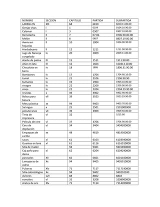 NOMBRESECCIONCAPITULOPARTIDA SUBPARTIDALADRILLOSXlll6868106810.11.00.00Ovejas vivasl101040104.10.90.00Calamarl303070307.10.00.00Remolachall707.060706.90.00.00Melónll808070807.19.00.00Avenaen hojuelasll1010041004.00.90.00Hierbabuenall1212111211.90.90.00Jugo de Naranja congeladolv2020092009.11.00.00Aceite de palmalll1515111511.90.00Atún en latalll161604160414.10.00Chocolate en barraIv 1818061806.31.90.00Bombones lv1717041704.90.10.00tamallv2121062106.90.90buñueloslv1919041904.10.00.00vinagrelv2222092209.00.00.00vinoslv2222042204.29.90.00revistasx4949024902.90.90.00Bolsas para basuravll3939233923.29.90.00Mesa plasticaxx9494039403.70.00.00Sal vigua x2525012501009900poliuteranosvll3939093909.50.00.00Tinta de impresoravl323215.90Pelicula de cine vl3737063706.90.00.00Cera de depilaciónvl3434043404200000Empaques de cartónxx4848194819500000sacosxl6161036103390000Guantes en lanaxl6161166116910000Silla de mader9494019401690000Coj paño para damaxl6262046204290000parasolesXll6666016601100000Lamaparas de vidrioXx9494059405910000PulserasXlv7171177117190000Silla odontologiasXx949402940210100Avionesxvll8888028802esmaltesvl3232083208900000Aretes de oroXlv7171147114200000CafeinaVl3535013501100000Telefax xvl8484438443392000ventiladorXvl8484148414510000Telemetro909015901510Balasa electricaX9090169016Consentrado para perrolv2323092309109000AlgodonnatutaXl5252035203000000Llantas para camionXvll8787088708701000Cigarrillolv2424022402900000Carbon mineralV2525142514000000PolvoraVl3636013601000000Jabon perfumadoVl3434013401Cera de abejaslv1515211521901000Canastos94646024602190000<br />