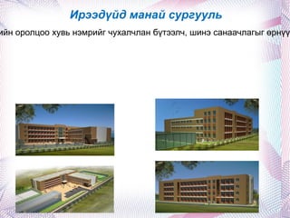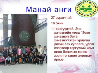Angin hural 1. 2. 3. 11 хөвгүүдтэй. Энэ хичээлийн жилд “Эзэн хичээвэл Заяа хичээнэ”гэсэн уриагаа дахин авч сурлага, урлаг спортоор тэргүүний хамт олон болохын төлөө зорилго тавин ажиллаж ирлээ. 4. Ирээдүйд манай сургууль Хүний хөгжлийг эрхэм зорилгоо болгон боловсролын шинэчлэл, боловсролын стандартыг амжилттай хэрэгжүүлж багш, сурагч, ажилтан бүрийн оролцоо хувь нэмрийг чухалчлан бүтээлч, шинэ санаачлагыг өрнүүлж сурах, сургах үүргээ дээдэлсэн “Итгэл-Сэтгэл-Үйлс”- ээрээ хамтран тэмүүлсэн дүүрэг, хотын тэргүүний ажиллагаатай хамт олон болно. 5. 6. Манай хамт олон Сурагч Д.Сайнзаяа, Ү.Бямбасүрэн нар нь “Алтан намар” урлагийн наадамд хамтлаг төрлөөр алтан медаль, өргөмжлөл 7. Сурагч Д.Сайнзаяа Дүүргийн хөл бөмбөгийн аварга шалгаруулах тэмцээнд II байр, мөнгөн медаль. Сургуулийн аварга шалгаруулах сагсан бөмбөгийн тэмцээнд багаараа II байр, мөнгөн медаль “ Их сорилго” уралдаанд Орос хэлний хичээлээр III байр “ Их сорилго”уралдаанд Монгол хэлний хичээлээр II байр Химийн хичээлийн АХА тэмцээнд III байр 8. Сурагч М.Цэрэнням Дүүргийн хөл бөмбөгийн аварга шалгаруулах тэмцээнд II байр, мөнгөн медаль Сургуулийн аварга шалгаруулах сагсан бөмбөгийн тэмцээнд багаараа IIбайр, мөнгөн медаль Улсын аварга шалгаруулах хөл бөмбөгийн тэмцээнээс алтан медаль Дуулиан 2020 хөл бөмбөгийн тэмцээнээс хүрэл медаль 9. 10. 11. 12. 13. 14. 15. 16. 17. 18. 19. 20. 21. 22. 23. 24. 25.