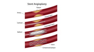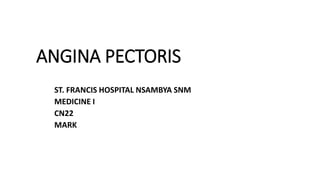 Angina pectoris is a clinical syndrome of chest pain due to transient myocardial ischemia without infarction. It occurs when oxygen demand of the heart exceeds its supply, usually due to coronary artery disease. There are four main types of angina - stable angina, unstable angina, variant angina, and microvascular angina. Diagnosis involves symptoms, ECG, and imaging. Treatment focuses on pain relief, slowing disease progression, and reducing future cardiac events through medications, lifestyle changes, and procedures like angioplasty. Complications can include heart attack, heart failure, and cardiac arrest if not properly managed.