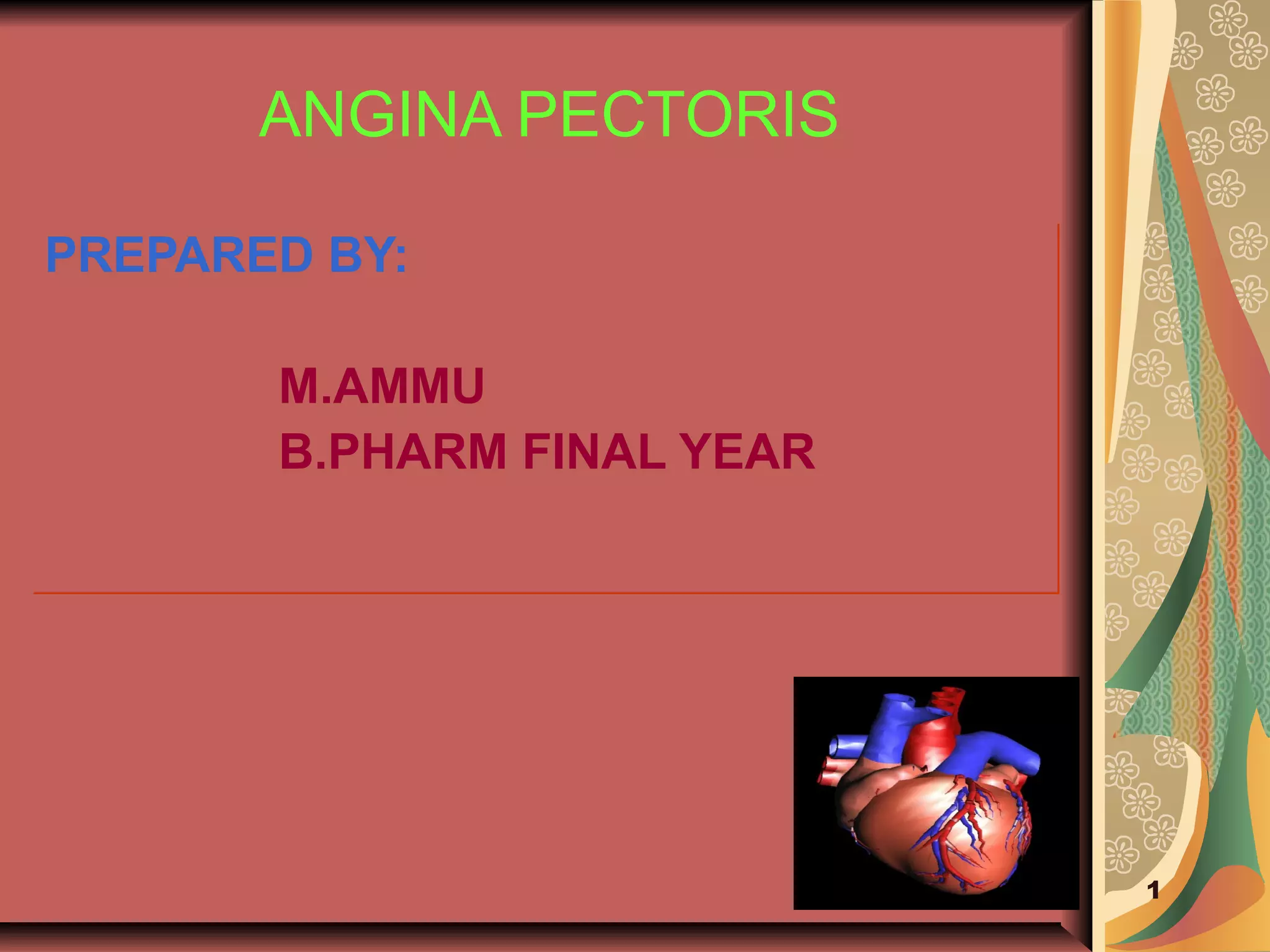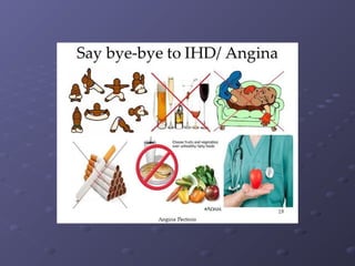 Angina pectoris is a clinical syndrome characterized by episodes of chest pain or pressure due to coronary artery disease. It occurs when myocardial oxygen demand exceeds supply. The document discusses the pathophysiology, risk factors, types, diagnosis and management of angina pectoris. Nursing interventions focus on treating episodes, reducing anxiety, and educating patients on prevention through lifestyle modifications and medication adherence. The goals are prompt relief of pain, decreased anxiety, avoidance of complications, and adherence to a self-care program.