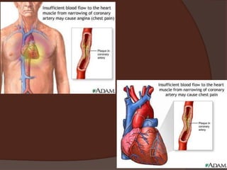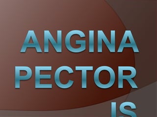 Angina pectoris is chest pain or discomfort caused by insufficient blood flow to the heart muscle. It is usually characterized by transient episodes of chest pain or pressure that is precipitated by physical exertion or emotional stress. There are different types of angina including stable angina, unstable angina, and variant angina. Common causes of angina include physical exertion, strong emotions, temperature extremes, cigarette smoking, sexual activity, and stimulant use. Angina pain typically feels squeezing, burning, or pressing and radiates to the left arm. Attacks usually last less than 5 minutes.
