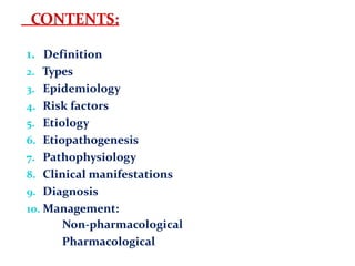 The document provides a comprehensive overview of angina pectoris, including its definition, types (stable, unstable, variant), and epidemiology, affecting approximately 112 million people globally. It discusses various risk factors, both modifiable and non-modifiable, as well as the etiology, pathophysiology, clinical manifestations, and diagnostic measures for angina. Management strategies are also detailed, covering non-pharmacological approaches and pharmacological treatments, including the use of nitrates and beta-blockers.