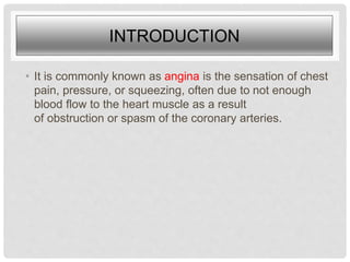 Angina pectoris, commonly known as angina, is a sensation of chest pain or pressure due to reduced blood flow to the heart muscle from obstruction or spasm of the coronary arteries. It is usually caused by coronary artery disease, an atherosclerotic process affecting the arteries feeding the heart. Angina is classified as stable angina, which occurs with exertion, or unstable angina, which occurs at rest or with minimal exertion and is more severe. Signs of angina include chest discomfort, pain in the epigastrum, nausea, and pallor. Risk factors include age, smoking, diabetes, dyslipidemia, hypertension, and certain medications. Diagnosis involves tests such as ECG,