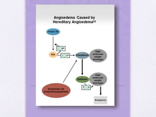 Angioedema is a rapid swelling of dermal and mucosal tissues, classified into hereditary and acquired types, often triggered by allergies, medications, or genetic factors. Symptoms include swelling, difficulty breathing, and pain, with diagnosis achieved through medical history and skin tests. While treatment varies, common approaches include antihistamines and corticosteroids, and the prognosis is generally good, especially when breathing is not affected.