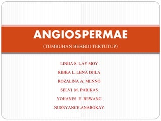 Dokumen ini menjelaskan tentang klasifikasi dan ciri-ciri angiospermae, yang dibagi menjadi dua kelas utama: monocotyledoneae dan dicotyledoneae. Setiap kelas memiliki subkelas dan ordo yang spesifik, serta ciri-ciri khas yang mencakup struktur batang, akar, dan bunga. Selain itu, dokumen ini mencantumkan berbagai spesies yang tergolong dalam setiap kelompok, termasuk famili dan genus tumbuhan.