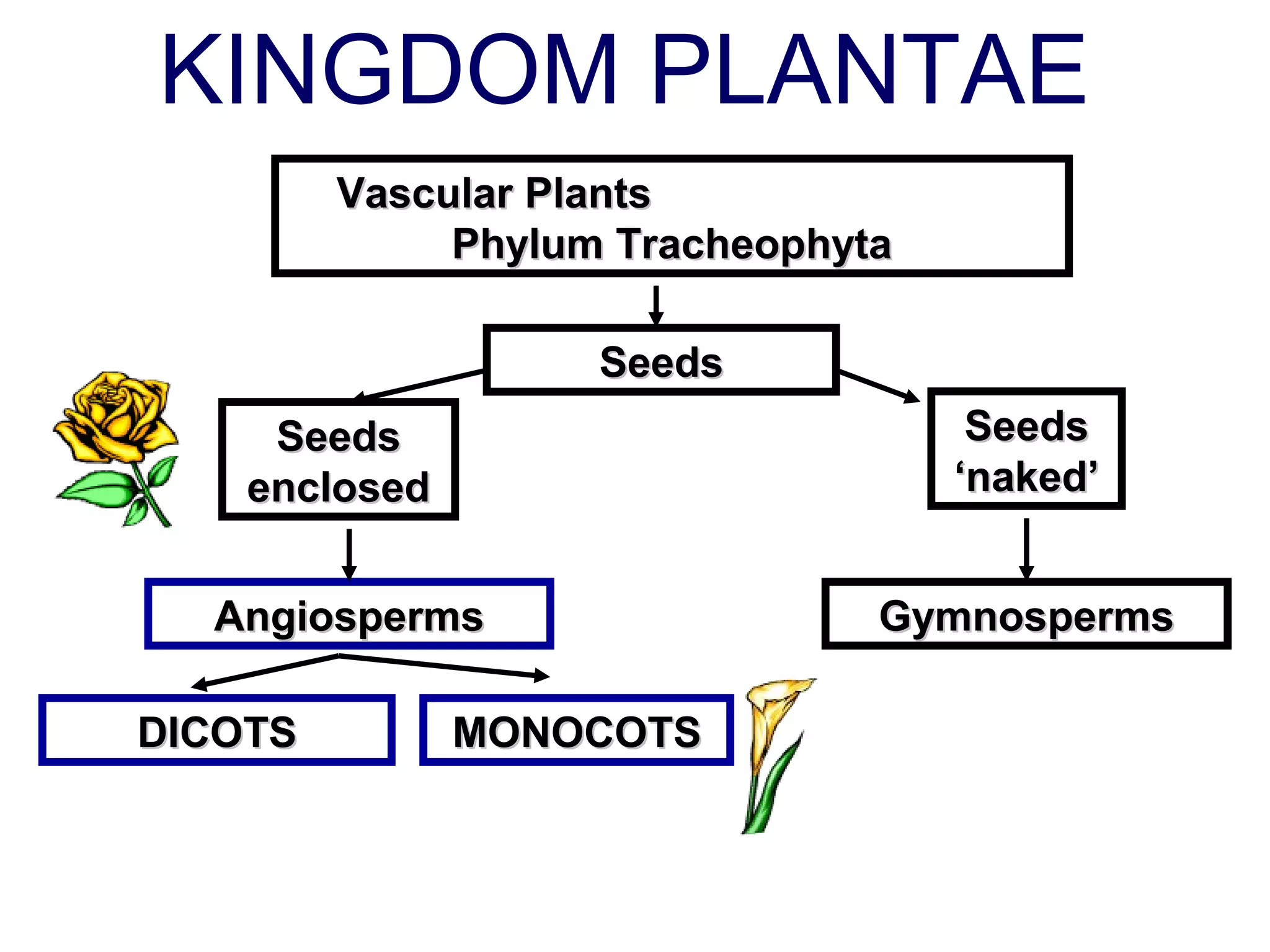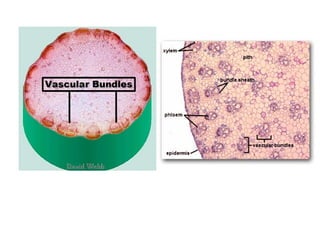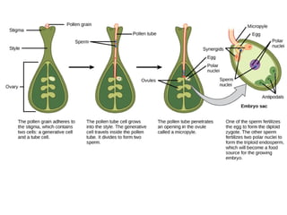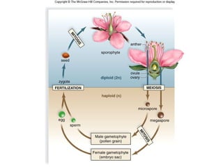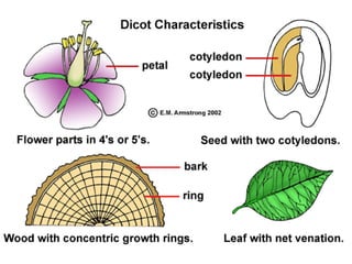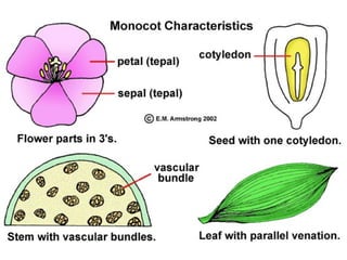 This document discusses the characteristics of vascular plants, specifically angiosperms. It describes that angiosperms have enclosed seeds protected inside a fruit. They have flowers, vascular tissue, and alternate between generations. Angiosperms are divided into monocots and dicots. Monocots have one cotyledon and parallel veins, while dicots have two cotyledons and branching veins. The document outlines the structures and functions of floral parts and how angiosperms reproduce through a process called double fertilization.