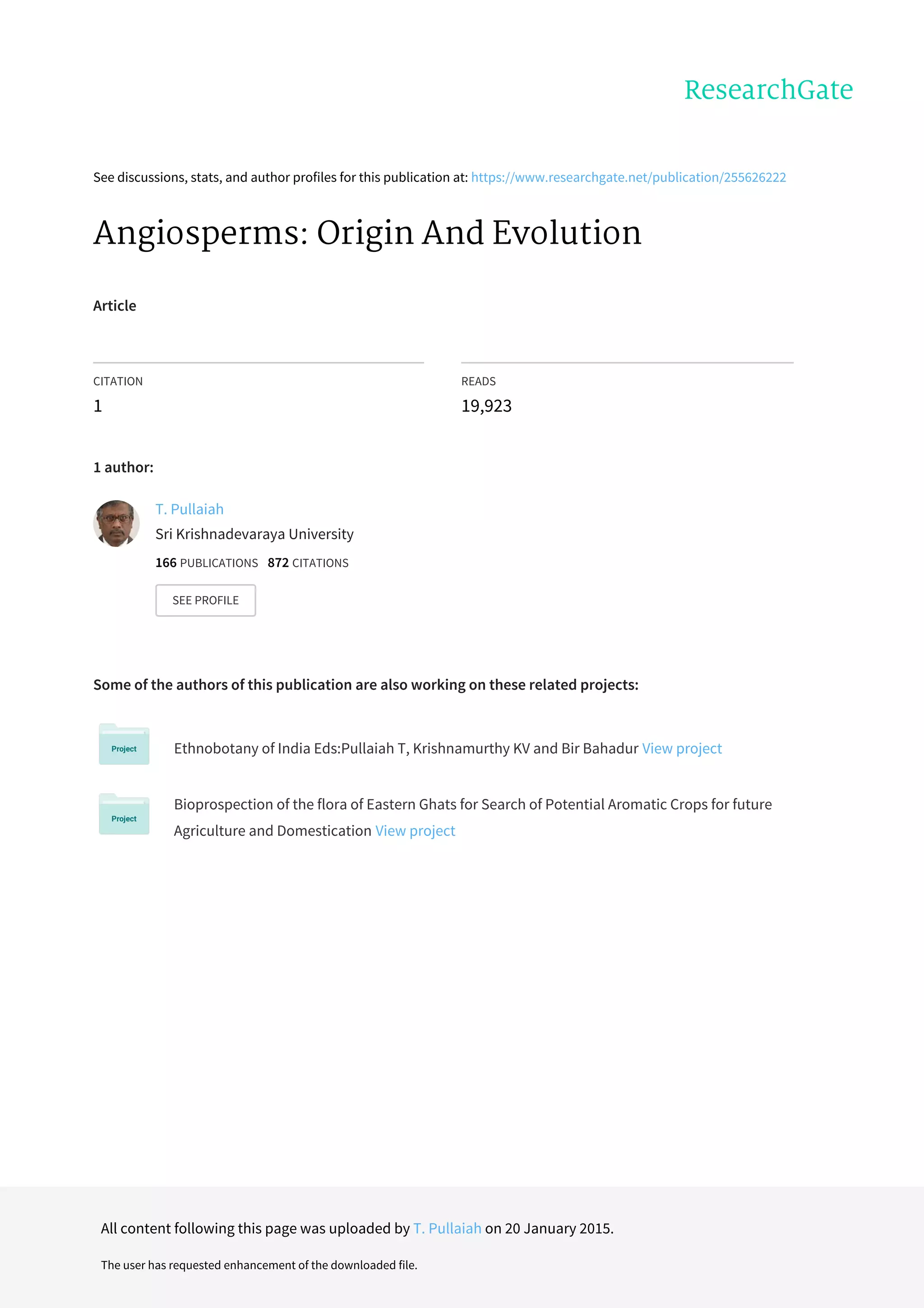 This document discusses various theories on the evolutionary origins of angiosperms (flowering plants). It describes several plant groups that have been proposed as possible ancestors of angiosperms, including Bennettitales, Gnetales, Isoetales, Coniferales, Pteridosperms, Pentoxylales, and Caytoniales. However, the document finds issues with considering each of these groups as the direct ancestors, due to morphological differences between their reproductive structures and those of angiosperms. No consensus exists on the exact ancestors of angiosperms. The last part of the document also describes but does not endorse the "Durian Theory" proposing the tropical fruit Durio zibethinus as a model for primitive