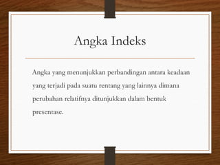 Dokumen tersebut menjelaskan tentang indeks angka, karakteristiknya, dan beberapa metode perhitungannya. Indeks angka adalah angka yang menunjukkan perbandingan antara keadaan pada rentang waktu dengan menggunakan presentase. Ada beberapa metode perhitungan seperti Laspeyres, Paasche, Drobisch, Irving Fisher, dan Marshall-Edgeworth yang melibatkan penggunaan faktor penimbang.