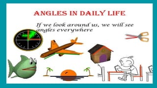 This document defines and describes the different types of angles in geometry. It states that an angle is formed by two rays sharing a common endpoint called the vertex. The types of angles are defined as: zero angle, acute angle measuring less than 90 degrees; right angle measuring exactly 90 degrees; obtuse angle measuring between 90 and 180 degrees; straight angle measuring 180 degrees; reflex angle measuring between 180 and 360 degrees; and complete angle measuring 360 degrees. Examples and illustrations are provided for each angle type.