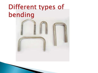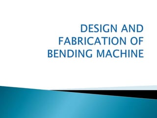 This document describes the design and construction of a portable bending machine to bend steel into various curved shapes. It discusses using various equipment to make the bending process faster and easier while keeping costs low. It then provides details on how to perform different types of bends for tubes, circles, channels, squares, and other materials using forming rollers, radius collars, and zero radius blocks. The last section briefly describes the operation of the bending machine, which uses two jigs mounted on a rotating circular plate powered by a motor to bend rods placed between the jigs.