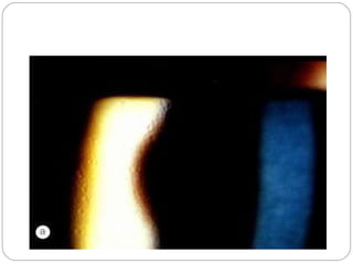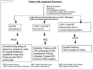 Angle closure glaucoma is caused by occlusion of the trabecular meshwork by the peripheral iris, obstructing aqueous outflow. It is classified as primary, relating to anatomical predisposition, or secondary, due to another ocular condition. The main mechanisms are pupillary block, where the iris bows forward and closes the angle, and plateau iris syndrome, where the iris is positioned anteriorly. Risk factors include shallow anterior chamber, older age, female sex, and hyperopia. Pupillary block occurs more commonly in winter due to lower light levels causing miosis.